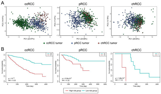 Diagnostic and prognostic performance analysis results for Renal Cell Carcinoma (RCC) subtypes. (A) Principal component analyses (PCA) plots, visualized by considering s-DIPs, indicating the individual differences in the gene expression profiles in tumor samples among the subtypes. (B) Kaplan–Meier curves estimating patients’ survival for three subtypes based on categorization of patients into high- and low-risk groups via prognostic index. ccRCC: Clear Cell Renal Carcinoma; pRCC: Papillary Renal Cell Carcinoma; chRCC: Chromophobe Renal Cell Carcinoma; HR: Hazard Ratio; PC: Principal component.