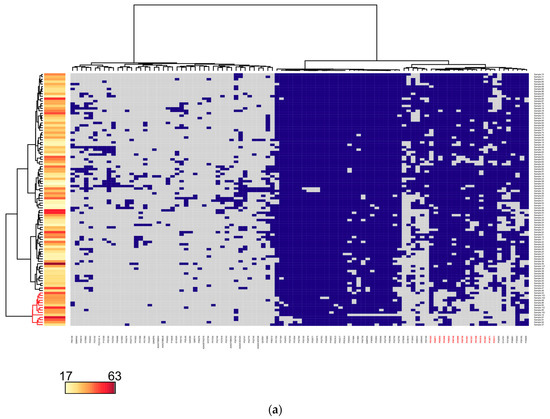 Cluster analysis of the presence/absence patterns of (a) 101 proteins (columns) in 104 blood plasma samples (rows) for all 104 samples under study (rows) and (b) 98 proteins (columns) in 83 samples, excluding plasma samples obtained from overweight individuals. The color bar indicates BMI.