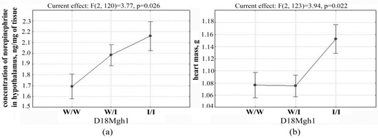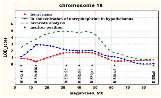 The most highly significant association of norepinephrine concentration in the hypothalamus was found with a genetic locus on chromosome 18. The significant extent of this QTL suggests that, in this region of chromosome 18, there are most likely several genes that may be involved in the genetic control of the norepinephrine concentration in the hypothalamus in ISIAH rats. In the central part of chromosome 18 in the region of marker D18Mgh1, this QTL overlaps with the locus previously described as associated with heart mass [26]. Despite the fact that the genetic control of heart mass in ISIAH rats was earlier associated with several genetic loci, only one of these was found to be associated with both heart mass and norepinephrine concentration in the hypothalamus (Figure 2). Accordingly, it is precisely in the central part of chromosome 18 in the region of the D18Mgh1 marker the closely linked genes controlling the manifestation of the studied traits, or genes with a pleiotropic effect on the traits “concentration of norepinephrine in the hypothalamus” and “heart mass” can be localized. Earlier, for this locus on chromosome 18, an association with the heart mass (Cardiac mass QTL 125, Cm125) was also found in the congenic rats SS.LEW-(D18Chm41-D18Rat92)/Ayd, in which the fragment of chromosome 18 (30.8—52.3 Mb) of Dahl salt-sensitive (DSS) rats, which are a model of the salt-sensitive hypertension, has been replaced by a fragment of the genome of normotensive Lewis (LEW) rats [30].