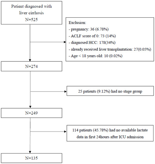 Patients who met the inclusion criteria comprise recurrent cirrhosis patients with ACLF admitted to our hospital’s hepato-gastroenterology ICU for intensive and specialized care from November 2012 to April 2015. Exclusion criteria included previously diagnosed HCC (hepatocellular carcinoma) before enrollment, age < 18 years old, pregnancy, ACLF score of 0 (absence of ACLF), orthotopic liver transplantation during follow-up, no available staging information during follow-up, and no available serum lactate level within the first 24 h after ICU admission.