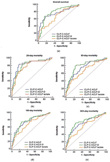Previous studies have already demonstrated that the CLIF-C ACLF score provides a reliable and better alternative to other prognostic scoring systems for patients with ACLF [21]. However, a comparison of the CLIF-C ACLF score with two newer prognostic scores, the CLIF-C ACLFlactate and CLIFACLF-D score, for patients hospitalized at our hepato-gastroenterologic ICU for the treatment of ACLF is intriguing and noteworthy. Overall, our data suggest that all three prognostic scores have sufficient prediction power for overall, short-term (28, 90-day), and long-term (180, 365-day) mortality among ACLF patients. The CLIF-C ACLF and CLIF-C ACLF-D scores were statistically superior to the CLIF-C ACLFlactate in a pairwise comparison of AUROC. These scores may therefore be superior tools to evaluate patient prognosis in our ICU.