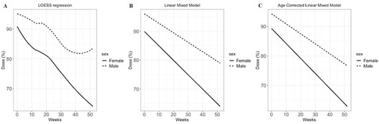 - Milano, G.; Etienne, M.C.; Cassuto-Viguier, E.; Thyss, A.; Santini, J.; Frenay, M.; Renee, N.; Schneider, M.; Demard, F. Influence of sex and age on fluorouracil clearance. J. Clin. Oncol. 1992, 10, 1171–1175. [Google Scholar] [CrossRef] [PubMed]