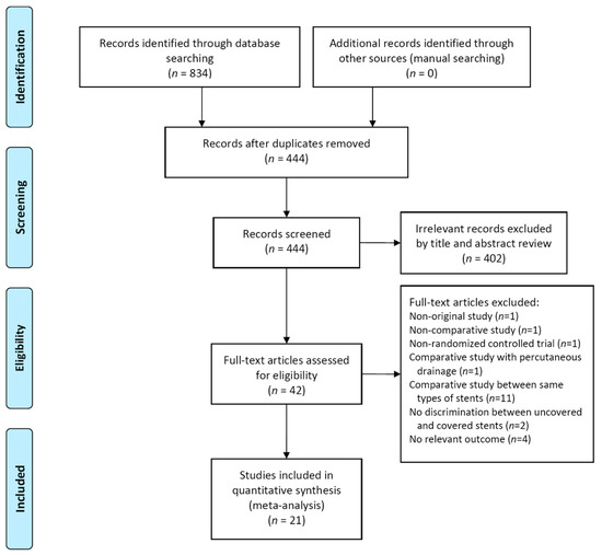 All relevant studies published between January 1990 and January 2020 that evaluated the efficacy of stents for palliation in patients with extrahepatic MBO were retrieved from the MEDLINE, EMBASE, and Cochrane Library databases. The following search string was used: ((bile duct) or (biliary) or (cholangiocarcinoma) or (cholangiocarcinomas) or (pancreatic) or (pancreas)) and ((obstruction) or (obstructive) or (stricture) or (strictures) or (jaundice) or (cholestasis)) and ((nonresectable) or (unresectable) or (palliation) or (palliative) or (palliating) or (inoperable)) and ((stent) or (stents) or (stenting) or (endoprostheses)) and (random*). Appendix A shows the detailed search strategies for each database. Additionally, we examined the references of the screened articles to identify additional relevant studies. Our search was last updated at 15 January 2020.