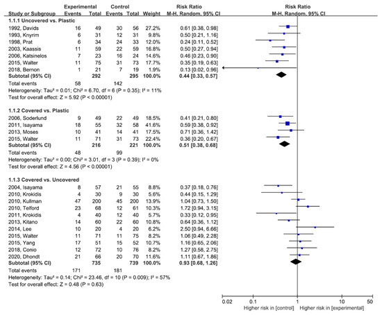Between the uncovered and covered SEMS groups, there was no significant difference in terms of RBO, but there was statistical heterogeneity (covered SEMS vs. uncovered SEMS: RR (95% CI) = 0.93 (0.68–1.26), df = 10, p = 0.009, I2 = 57%). Publication bias was assessed for RBO between the uncovered and covered SEMS groups. We did not detect any corresponding publication bias using the Begg and Mazumdar-adjusted rank correlation tests (p = 0.938). Asymmetry was not observed upon the visual inspection of the funnel plot (Figure S3).