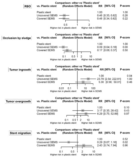 In Figure 3, forest plots show the network estimates of RBO and its causes in the uncovered and covered SEMS groups compared with the plastic stent group. Both uncovered and covered SEMS groups showed a lower risk of RBO compared to the plastic stent group (RR (95% CI): uncovered SEMS vs. plastic stent, 0.46 (0.35–0.62); and covered SEMS vs. plastic stent, 0.46 (0.34–0.62)). There was no significant difference between the uncovered and covered SEMS groups (uncovered vs. covered: RR (95% CI) = 1.02 (0.80–1.30)). Plastic stents had the highest P-score (>99%), followed by uncovered SEMS (28%) and covered SEMS (22%).