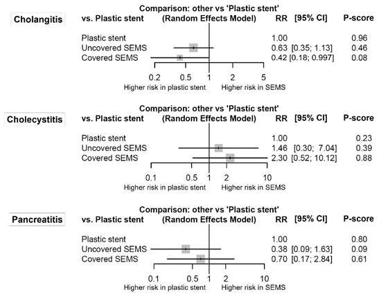 Figure 4 shows the forest plots for stent-related inflammation. Although cholangitis was marginally more common in the plastic stent group than in the covered SEMS group (RR (95% CI) = 2.37 (1.003–5.60)), there was no significant difference or network inconsistency in any other comparison.