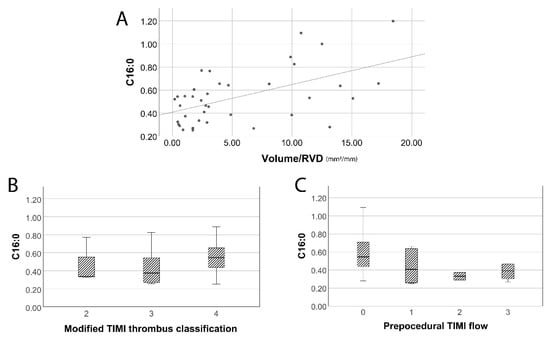 (A) Serum ceramide C16:0 levels were positively correlated with larger aspirated thrombus volume. (B) The median C16:0 level of patients with TIMI thrombus Grade 4 was higher compared to the corresponding levels of patients with lower TIMI thrombus Grades (2 and 3). (C) The median C16:0 levels were higher in patients with worse pre-procedural TIMI flow.