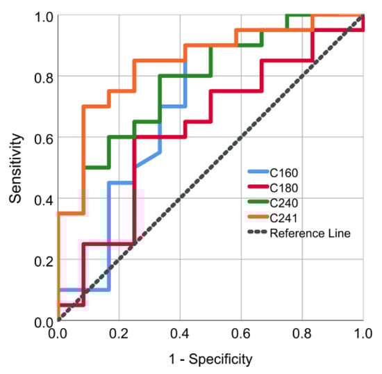 Additionally, we performed receiver operating characteristic (ROC) analysis to investigate the sensitivity and specificity of ceramides as predictive parameters of intracoronary thrombus burden and propose exact prognostic cut-off values of ceramide levels. The ROC curves, depicted in Figure 3, demonstrate that higher serum levels of ceramides 24:0 and 24:1 were significantly associated with higher intracoronary TB, as assessed via modified TIMI classification (area under the curve: 0.788, 95% CI: 0.629–0.946 and 0.846, 95% CI: 0.706–0.985, respectively). Specifically, ceramide C24:0 levels above 6.77 μΜ and C24:1 above 2.71 μΜ were significant predictive biomarkers of higher thrombus grade with sensitivity of 80% & 85% and specificity 66% & 75%, respectively. Regarding ceramide C16:0 levels, a non-significant predictive value was observed with area under the curve: 0.698, 95% CI: 0.493–0.903. Lastly, the Spearman correlation analysis between ceramide levels and clinically useful biomarkers (high-sensitivity troponin, CK-MB and d-dimers) did not yield any significant outcome (p-values > 0.05).