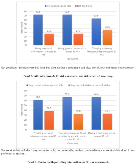 Sociodemographic variables were assessed for participants’ age, ethnicity, marital status, educational level, employment status, annual family income, and province of residence. Other covariates considered include perceived health status, personal history of BC, perceived lifetime susceptibility to BC, personal experience of mammography and genetic testing for BC, and family experience of genetic testing for BC.