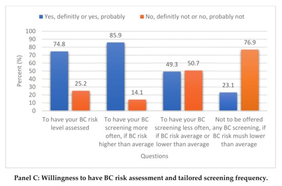 Willingness to have BC risk assessed and tailored screening frequency was evaluated by the following four questions: “Would you be willing to have your breast cancer risk level assessed using information mentioned above? This would mean being told whether you are at average, lower than average, or higher than average risk of developing breast cancer”, “If your estimated level of breast cancer risk was higher than average, would you be willing to have your breast cancer screening more often than every 2 to 3 years?”, “If your estimated level of breast cancer risk was average or lower than average, would you be willing to have your breast cancer screening less often than every 2 to 3 years?”, and “If your estimated level of breast cancer risk was much lower than average, would you be willing not to be offered any breast screening?”. Responses were collected on a 5-point Likert scale with options dichotomized as “yes, definitely/yes, probably” vs. “no, definitely, not/no, probably, not/not sure/prefer not to answer”.
