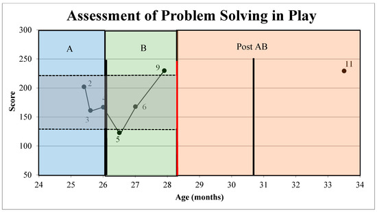 Assessment of Problem Solving in Play Across the AB +1 Phases. Scores of Assessment of Problem Solving in Play (APSP) (reported in frequency APSP/minute) across the AB +1 phases as plotted in reference to the grey shaded +/− 2 standard deviation band. A = baseline data collection with no intervention, B = Botulinum toxin A/phenol and START-Play physical therapy intervention provided during data collection, Post AB = data point 11 collected via telemedicine (+1). Points 2–9 and point 11 represent administered APSP data points. Points 1, 7, 8, and 10 were omitted from the figure as these data collection days did not include APSP testing due to testing site or child-related limitations. Bolded, black, vertical lines denote Botulinum toxin-A/phenol injections. The bolded, red vertical line denotes treatment ending due to the Covid-19 pandemic.