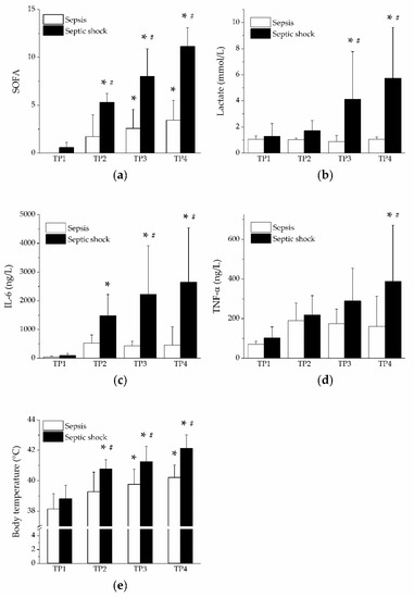 Sequential organ failure assessment (SOFA) score, lactate, cytokines and body temperature. Open columns, sepsis; filled columns, septic shock. *, p < 0.05 vs. baseline (TP1); #, p < 0.05 vs. sepsis. (a) SOFA score in sepsis and septic shock; (b) plasma levels of lactate in sepsis and septic shock; (c) plasma levels of IL-6 in sepsis and septic shock; (d) plasma levels of TNF-α in sepsis and septic shock; (e) body temperature in sepsis and septic shock.