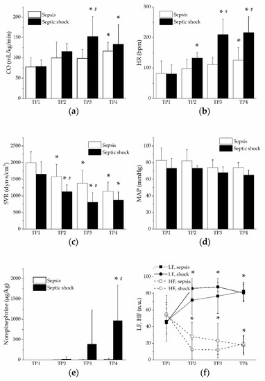 Hemodynamics and vasopressors. Open columns, sepsis; filled columns, septic shock. *, p < 0.05 vs. baseline (TP1); #, p < 0.05 vs. sepsis. (a) Cardiac output in sepsis and septic shock; (b) heart rate in sepsis and septic shock; (c) systemic vascular resistance in sepsis and septic shock; (d) mean arterial pressure in sepsis and septic shock; (e) norepinephrine dose in sepsis and septic shock. (f) low-frequency (LF) and high-frequency (HF) bands in sepsis and septic shock. Open symbols, HF. Filled symbols, LF.