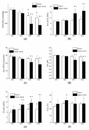Respiratory gases and acid-base balance. Open columns, sepsis; filled columns, septic shock. *, p < 0.05 vs. baseline (TP1); #, p < 0.05 vs. sepsis. (a) PaO2/FiO2 ratio in sepsis and septic shock; (b) arterial pCO2 in sepsis and septic shock; (c) arterial bicarbonate in sepsis and septic shock; (d) arterial pH in sepsis and septic shock; (e) mixed venous (pulmonary artery, PA) pO2 in sepsis and septic shock; (f) mixed venous (pulmonary artery) O2 saturation (SvO2) in sepsis and septic shock.
