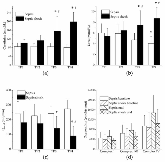 Renal functions. Open columns, sepsis; filled columns, septic shock. *, p < 0.05 vs. baseline (TP1); #, p < 0.05 vs. sepsis. (a) Creatinine plasma levels in sepsis and septic shock; (b) Urea plasma levels in sepsis and septic shock; (c) Renal blood flow in sepsis and septic shock; (d) Oxygen consumption by mitochondrial complexes I, I+II and IV measured by ultrasensitive oxygraphy. Group of sepsis at baseline and at the end of the experiment. Group of septic shock at baseline and at the end of the experiment.
