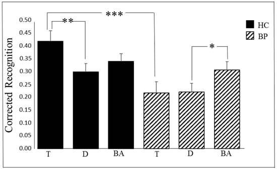 Mean proportions of corrected recognition (hits—false alarms) in bipolar patients (BP) and healthy control subjects (HC) as a function of trial type. Bars represent SEs. Note: * p < 0.05; ** p < 0.01; *** p < 0.001; T, target images; D, distractor images; BA, baseline images; HC, healthy controls; and BP, bipolar patients.