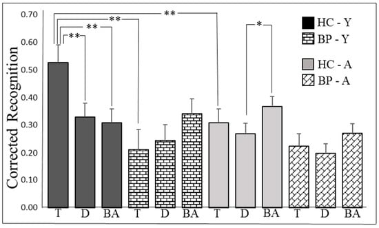 Mean proportions of corrected recognition (hits—false alarms) in bipolar patients (BP) and healthy control subjects (HC) as a function of trial type and age range (Y—young-adults, A—adult subjects). Bars represent SEs. Note: * p < 0.05; ** p < 0.01; T, target images; D, distractor images; and BA, baseline images.