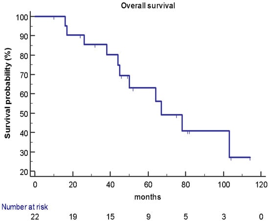 OS in the study population (n = 22): median OS was 67 months (95% CI 45–103).