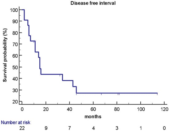 DFS in the study population (n = 22): median DFI was 15 months (95% CI 11–46).
