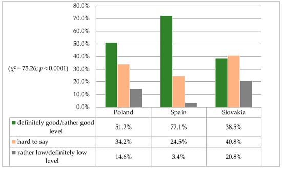 In the following analyses, an attempt was made to find a subjective assessment by the nursing students concerning the extent to which patients’ rights were respected in healthcare facilities in Poland, Spain and Slovakia. The distribution of the results was significantly different (χ2 = 75.26; p < 0.0001). It was found that 72.1% of nursing students from Spain, 51.2% from Poland and 38.5% of students from Slovakia rated the respect of patients’ rights as good (Figure 1). On the other hand, one in five students from the Slovak group (20.8%) also indicated a disadvantageous situation for the patient, indicating that the level of respect for patients’ rights was rather low or definitely low (Figure 1).