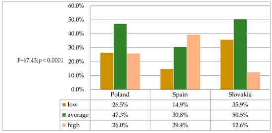 After establishing low, average and high scores, special attention was paid to the proportion of the surveyed students who rated their competence in the area of patients’ rights as low. As it turned out, as many as 35.9% of students from Slovakia, 26.5% from Poland and 14.9% from Spain were quite critical and indicated in the self-assessment a low level of knowledge of patients’ rights (Figure 2).