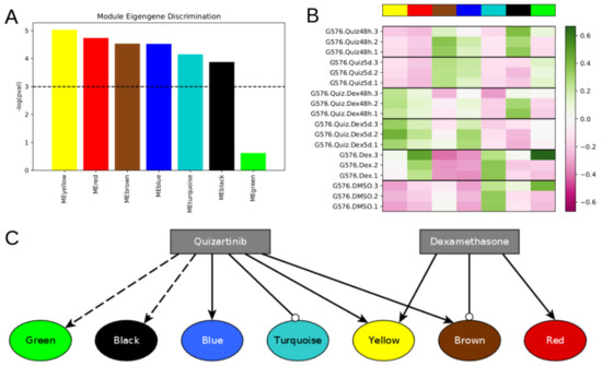 Differentially expressed modules respond differently to different treatment conditions. (A) WGCNA identified seven gene co-expression modules from the DMSO and drug treated FLT3-ITD AML expression dataset, six of which are differentially expressed across the six different treatment conditions. (B) Heatmap showing module eigengene expression for each module in each sample. High module eigengene expression reflects high average expression of genes within that module. (C) Qualitative model showing the effect of each drug on the expression of genes within each module. Arrow-tipped edges indicate activation, while circle-tipped edges indicate repression. The dotted edge from quizartinib to the black module reflects the observation that black module genes are upregulated at 48 h by quizartinib, but become downregulated again by five days of treatment. The dotted edge from quizartinib to the green module reflects that the green module is not upregulated after 48 h, but is after 5 days.