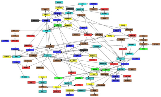 To build the network, we integrated interactions from multiple databases that aggregated literature-based or predicted interactions, SIGNOR [14], TRRUST [15], and RegNetwork [16], as well as published networks related to AML [14,17], NFKappaB signaling [17], NOTCH signaling [18], tumor promoting inflammation [19,20], and apoptosis [20].