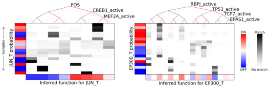 Examples demonstrating BooleaBayes regulatory function inference. Left: the inferred function for JUN transcription. JUN_T has three regulators: FOS, CREB1_active, and MEF2A_active. A Boolean function of 3 regulators has 23 = 8 possible input configurations (e.g., FOS = 0, CREB1_active = 0, MEF2A_active = 0). Each column of the figure corresponds to one of the possible regulator configurations, from all regulators being OFF (left-most column) to all regulators being ON (rightmost column). Each row corresponds to one of the 18 AML samples. The red and blue colors along the far left show whether JUN_T (the target node) is ON or OFF in each sample. The white-black color scale shows how closely each sample (row) corresponds to a given input configuration (column). For example, the top three samples (rows) are most likely to correspond to FOS = 1, CREB1_active = 1, MEF2A_active = 0, as is shown by the black and dark grey cells in the first three rows of that column. In both samples, JUN_T is likely to be OFF (indicated by the blue color). Thus, the inferred regulatory function for JUN_T (bottom row) says that if FOS = CREB1_active = MEF2A_active = 0, JUN_T is very likely to turn OFF. Right: inferred function for EP300 transcription. Unlike JUN_T, there are many conditions for which there was no observed data, such as RBPJ_active = 0, TP53_active = 0, TCF7_active = 0, and EPAS1_active = 1 (second condition from the left). In these cases, the inferred rule has a near 50% chance for EP300_T to turn ON or OFF, as there are no data indicating what should happen in these cases.