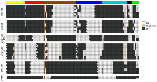 Pseudo-attractors corresponding to DMSO and drug-treated AML, which are also the attractors of the deterministic approximation of the BooleaBayes network. The values of the network’s 65 source nodes are fixed to match one of the six treatment conditions, including DMSO, and attractors of the reduced systems are shown above. Each row is one attractor, and columns are nodes of the network. Columns are grouped and colored based on the module the node belongs in. The vertical orange lines delimit the nodes of each module.