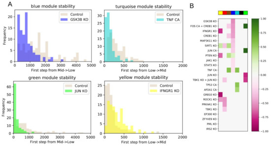 Following intervention, if a module requires more steps before it switches from low to intermediate activation, or vice versa, compared to WT, then the module’s original state was stabilized by the intervention. If the module began in the low state, we then classified the intervention as down-regulating. If the module began in the high state, we classified the intervention as up-regulating. Conversely, if an intervention makes a module require fewer steps to switch, then the module’s original state was destabilized by the intervention. If the module began in the intermediate state, we classified the intervention as down-regulating. If the module began in the low state, we classified the intervention as upregulating.