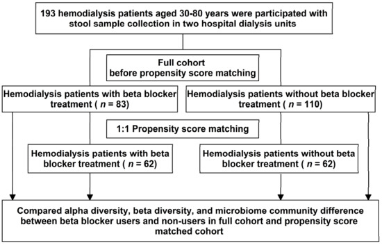 The Ethics Committee approved the study protocols of Kaohsiung Medical University Hospital (KMUHIRB-E(I)-20160095 and KMUHIRB-E(I)-20180118) and Taipei Tzu Chi Hospital (07-X01-002). All participants provided written informed consent. Hemodialysis patients were recruited from the dialysis unit of Taipei Tzu Chi Hospital and Kaohsiung Medical University Hospital in Taiwan from August 2017 to February 2018. The inclusion criteria were patients with age more than 18 years old and received regular hemodialysis three times per week, 3.5–4 h with high-flux dialyzers. The exclusion criteria included patients with partial or total colectomy, inflammatory bowel diseases, active malignancies, or patients who were prescribed antibiotics within three months before enrollment. Fecal samples were collected from 193 stable hemodialysis patients and analyzed by high-throughput 16S ribosomal RNA gene sequencing to compared participants with and without β-blocker treatment. All β-blocker users were prescribed for at least one month.