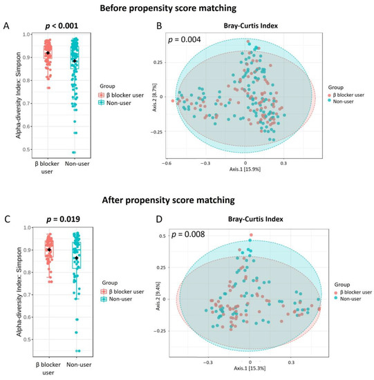 The α-diversity and β-diversity in hemodialysis patients with and without β blocker used in full cohort (A,B) and propensity score matching cohort (C,D). β blocker users had a higher α-diversity than β blocker nonusers in full cohort (A) and propensity score matching cohort (C) β blocker users had a different β-diversity (Bray–Curtis index) compared to β blocker nonusers in full cohort (B) and propensity score matching cohort (D). The β-diversity p-value was calculated using the homogeneity of group dispersions by the Permutational Analysis of Multivariate Dispersions (PERMDISP) test.