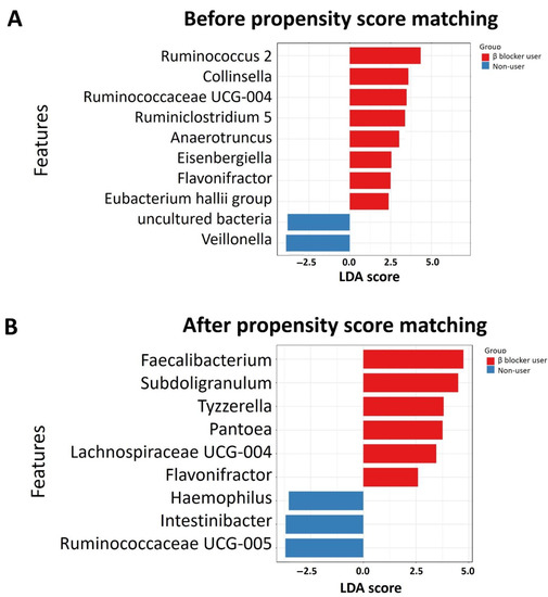 Taxonomic differences were detected between β blocker users and nonusers in the full cohort (A) and propensity score matching cohort (B). Linear discriminative analysis (LDA) effect size (LEfSe) analysis between β blocker users (red) and nonusers (blue) with an LDA score > 2.0 or < −2 with p-value > 0.1 among β blocker users and nonusers.