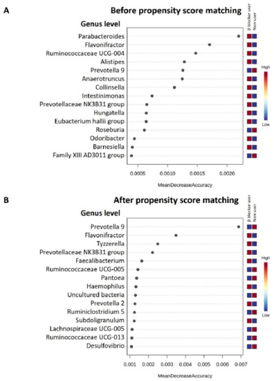 Determination of specific bacteria for discriminatory across hemodialysis patients with and without β blocker treatment in full cohort (A) and propensity score matching cohort (B). The discriminatory taxa were determined by applying Random Forest analysis using the genus-level abundance.