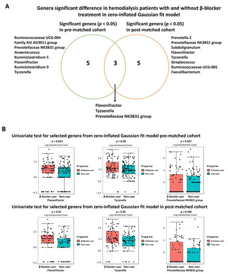 The genera difference between β blocker users and nonusers in the full cohort and propensity score matching cohort using zero-inflated Gaussian fit model. (A) The Venn diagram showed the different significant genera in the full cohort and propensity score-matched cohort. (B) Univariate test between selected genera from zero-inflated Gaussian fit model. Significance was considered for p < 0.05.