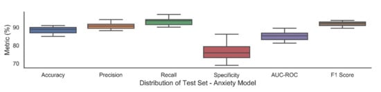 Box plots exhibiting average performance with standard deviation over 30 trials for anxiety.