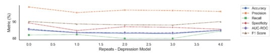 Average performance with standard deviation over 30 trials, for depression, over five repetitions.