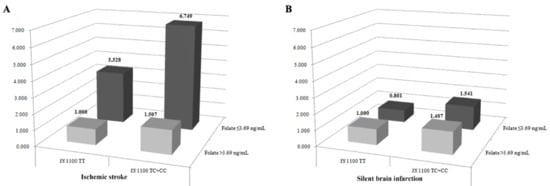 Interaction analysis of the risk of ischemic stroke and silent brain infarction (SBI) based on TS 1100T>C and stratified by folate level. (A,B) show the interaction between TS 1100T>C polymorphisms and folate levels in ischemic stroke (A) and SBI (B). Genotypes were classified into a dominant model (TT genotype vs. TC+CC genotype), and subjects were divided into subgroups based on a plasma folate cutoff level of 15%, which corresponded to a plasma folate level ≤3.69 ng/mL. The TT genotype with high folate levels (>3.69 ng/mL) was used as the reference group, and the other groups were defined as TT genotype and low folate (≤3.69 ng/mL), TC+CC genotype and high folate, and TC+CC genotype and low folate. We analyzed the synergistic effects between low folate levels and TS 1100T>C polymorphism. (A) Interaction between the TS 1100 TC+CC genotypes and low folate level (≤3.69 ng/mL) synergistically increased the likelihood of ischemic stroke (AOR = 6.749, P < 0.0001). (B) In contrast, the presence of TS 1100 TC+CC and low folate level (≤3.69 ng/mL) predicted lower SBI occurrence than ischemic stroke (AOR = 1.541, P < 0.0001).