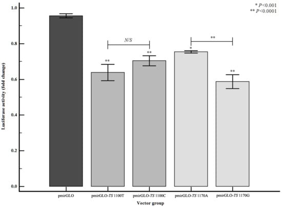 Regulation of TS gene expression in the presence of TS 3′-UTR polymorphisms in EA.hy926 cells. Luciferase activity was measured according to the TS 3′-UTR polymorphisms: 1100T, 1100C, 1170A, and 1170G. Luciferase activity was decreased by each polymorphism compared to the pmirGLO positive control (vs. pmirGLO-TS 1100T, P < 0.0001; vs. pmirGLO-TS 1100C, P < 0.0001; vs. pmirGLO-TS 1170A, P < 0.001; vs. pmirGLO-TS 1170G, P < 0.0001). The expression level of the 1170G allele was significantly reduced compared to the A allele (P < 0.0001). Note; ‘*’ and ‘**’ where the line for the comparison object is not indicated are the indications of the p-value obtained by comparing with pmirGLO, and N/S is an abbreviation of no significance.