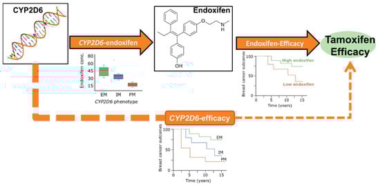 - Puszkiel, A.; Arellano, C.; Vachoux, C.; Evrard, A.; Le Morvan, V.; Boyer, J.C.; Robert, J.; Delmas, C.; Dalenc, F.; Debled, M.; et al. Model-Based Quantification of Impact of Genetic Polymorphisms and Co-Medications on Pharmacokinetics of Tamoxifen and Six Metabolites in Breast Cancer. Clin. Pharmacol. Ther. 2020. [Google Scholar] [CrossRef] [PubMed]