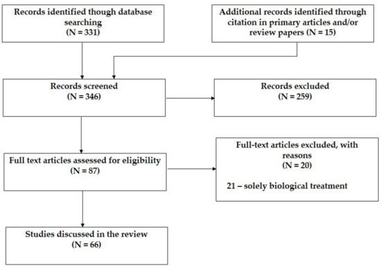 Three-hundred and thirty-one articles were yielded initially through an online database search, while an additional 15 papers were identified through examining the references of the review papers. The resulting 346 articles were then evaluated based on title, abstract, and keywords, which led to the exclusion of 259 articles. The full text of the selected 87 articles was accessed, which resulted in the exclusion of 21 articles that focused solely on biological treatment. Finally, 66 articles were selected and included in the review. Out of those, 54 were primary articles and 12 were randomized clinical trials. Our selection strategy for original research is illustrated with the appropriate flow diagram in Figure 1.