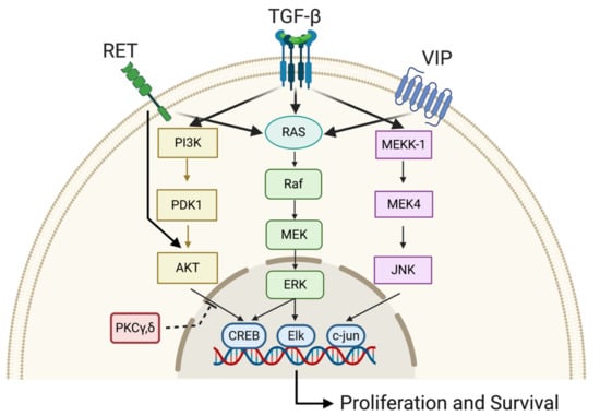 In addition to PI3K, vascular endothelial growth factor receptor 2 (VEGFR2), epidermal growth factor receptor (EGFR), and rearranged during transfection (RET) pathways were also found to be essential for RA-mediated differentiation. Their antagonist, Vandetanib, impedes neurite formation in RA-treated SH-SY5Y, SKN-BE2n, SKN-BE2c cell lines at concentration 5 μmol/L [47]. While Vandetanib affects a broad range of cellular cascades, the examined interference with RA signalling might be attributed to the effects of RET pathway. A combination of ATRA with D4 aptamer, a construct binding specifically to the RET receptors, inhibited neurite outgrowth and decreased the expression of maturation markers VGF, GAP-43, and tissue transglutaminase [48]. In turn, GDNF, a RET receptor agonist, was able to induce NB differentiation; still, the cotreatment results with ATRA were the same as any drug alone, suggesting that the RA and RET pathways share the downstream signalling elements [49].