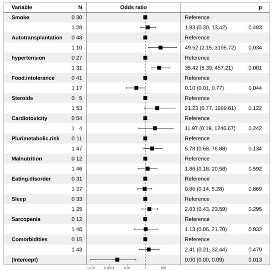 The univariate logistic regression highlighted a significantly high risk of MetSyn in survivors affected by hypertension (HR: 10.98; p-value: 0.000158). A statistical trend indicating a high risk of MetSyn in patients that underwent ASCT has also been observed (HR: 7.96, p-value: 0.06), as well as a higher risk of MetSyn onset, which was observed among subjects who had poor physical activity (HR: 0.32; p-value: 0.02) and those who followed an unbalanced diet (HR: 0.30; p-value: 0.02) (Table 3). The multivariate logistic regression for MetSyn highlighted a higher risk in patients that underwent ASCT and who had hypertension (HR: 49.52 and 35.42, respectively).