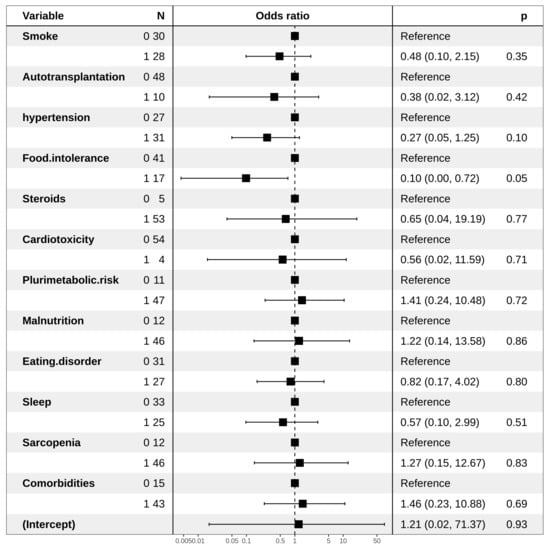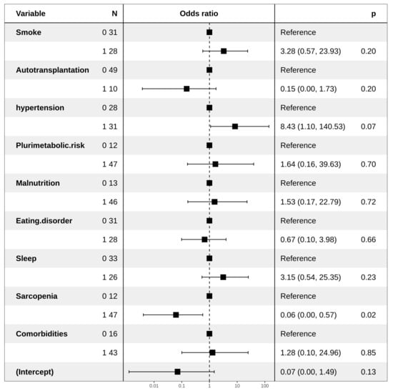 Univariate and multivariate logistic regression were performed through a generalized linear model, using binomial family and logit link. The “MASS” R package was used in the R studio Version 1.1.447 [30]. The results are reported as hazard ratio and 95% confidence interval, and they were considered significant when the p-value was > 0.05. The mean comparison of serum and anthropometric parameters was evaluated using the analysis of variance (ANOVA). A p-value ≤ 0.05 was considered statistically significant.