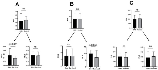 High levels of blood biomarkers such as NLR, PLR, and MLR have been reported in certain inflammatory conditions, including various types of infections [23,25,26]. Notably, in comparison with previous data from a study that included 500 healthy individuals with a similar background (Hispanic population), whose normal values are as follow: PLR, mean SD 125.4 ± 36.3, median 120; NLR, mean SD 1.80 ± 0.65, median 1.70; and MLR, mean SD 0.23 ± 0.07, median 0.21 [24], the levels of these three inflammatory markers (NLR, MLR, and PLR) among the hospitalized patients included in this study were considerably higher (Table 3). Hence, a potential association between PLR, NLR, and MLR levels with in-hospital mortality among patients with CKD and those without CKD was assessed. When comparing the entire population, there were no statistically significant differences in MLR levels between patients with CKD and those without CKD (Figure 2A, upper panel), however, as shown in the lower panel of Figure 2A, among patients with CKD, significantly higher levels of MLR were observed in the deceased patients compared with those who survived (p = 0.001) but such differences were not observed among non-CKD patients. NLR levels were somewhat higher among patients without CKD (control) who died in hospital compared with those who survived (Figure 2B). Conversely, PLR did not correlate with the survival outcome in both groups (Figure 2C).