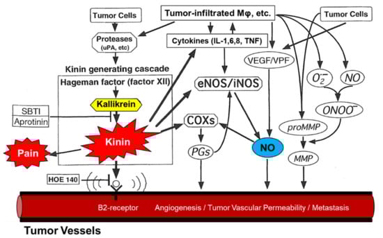 As a historical aside, before I describe the vascular permeability of solid tumors, I should mention that we first studied bacterial infection and inflammation with a focus on the role of proteases produced by bacteria [,,,]. We then found that the bradykinin-generating cascade of endogenous proteases was activated by exogenous proteases produced by bacterial infection. That is, the sequence of the cascade was Hageman factor or factor XII → kallikrein → kininogen → bradykinin (kinin) (Figure 1). Kinin is a nonapeptide (RPPGFSPFR) cleaved off from kininogen in the plasma, and it induces vascular permeability, severe pain, and various signaling molecules. All microbial proteases including fungi trigger the cascade system, of which multiple steps are affected (Supplementary Figure S1) [,]. Activated endogenous proteases function in two important pathways: (i) thrombin activation and then fibrin formation, and (ii) kinin generation (Supplementary Figure S1), which is a key factor in vascular permeability in tumors, bacterial infections, and inflammation [,,,,]. Ascitic and pleural effusions in carcinomatosis also largely depend on kinin generation in vivo [,,,,,,,].