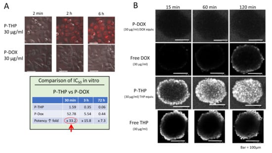 Comparison of the cellular uptake of P-THP—the poly(hydroxypropylmethaacrylamide [HPMA]) conjugate of pirarubicin (THP)—and P-DOX (HPMA polymer-DOX conjugate) by human pancreatic cancer cells (SUIT-2) in vitro. (A) Polymeric P-THP shows a far greater uptake by tumor cells compared with P-DOX: at 30 min, P-THP had a 33.2-fold higher uptake, and its cytotoxicity had greatly increased (see Table at lower left). (B) Penetration of P-DOX, DOX, P-THP, and THP into spheroidal tumor colon cancer (Adapted with permission from ref. [,]. 2016 American Chemical Society, 2019 American Chemical Society). Far greater penetration of P-THP into the tumor spheroid (similar to Figure 2, Table) is seen.