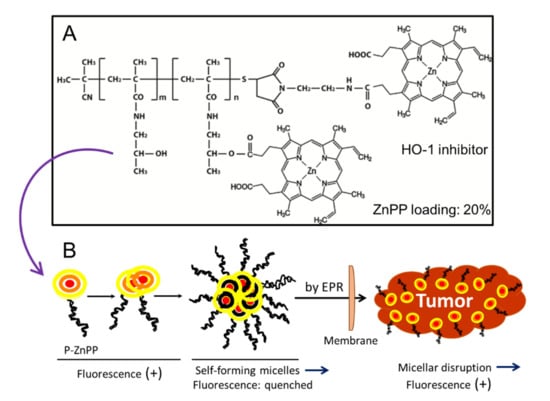 Self-assembling PS polymer conjugates of HPMA and ZnPP. (A) Chemical structure of the HPMA-PS polymer conjugate. (B) Polymer-ZnPP in solution. Spontaneous micelles were formed. Quenching occurs in the self-forming micellar form of P-ZnPP, which leads to a lack of fluorescence in the micellar form. When tumor cells take up these micelles, the micelles disintegrate during the traversing lipid bilayer due to its amphiphilic nature. Then, fluorescence becomes positive and singlet oxygen (ROS) are generated in the tumor upon light irradiation (B). ZnPP itself also inhibits heme oxygenase-1 (HO-1) and suppresses tumors (see text for details).