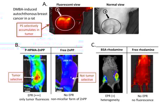 Fluorescence imaging of breast cancer in a rat and of implanted S180 tumor in a mouse, after intravenous injection of P-ZnPP. (A) DMBA (7,12-dimethylbenz[a]anthracene)-induced breast cancer in a rat. Under fluorescent light (left) and under normal light (right). (B) Fluorescent image of nano-PSs: polymeric HPMA-ZnPP (P-HPMA-ZnPP) and free ZnPP. (C) Rhodamine-conjugated bovine albumin (BSA) vs. free rhodamine. Images show no accumulation of LMW free PSs in tumors (B,C). (A, adapted from []; B,C, adapted from ref. []).