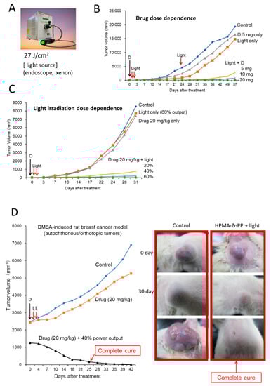 Photodynamic therapy (PDT) with polymeric PSs. (A) View of the light source for the endoscope; a xenon lamp was used. (B) Dose dependence of P-ZnPP dosage, marked D. (C) Dose of light irradiation intensity. The D indicates the time of drug injection of P-ZnPP in B and C. The power of irradiation light (%) is relative to full power output of the endoscope (100%). (D) Results of PDT treatment of DMBA-induced breast cancer in rats. L, light irradiation. D, drug injection. Control received only light. Boxed images at right show growth and suppression of tumor after PDT and P-ZnPP treatment (right) and tumor without treatment (left).